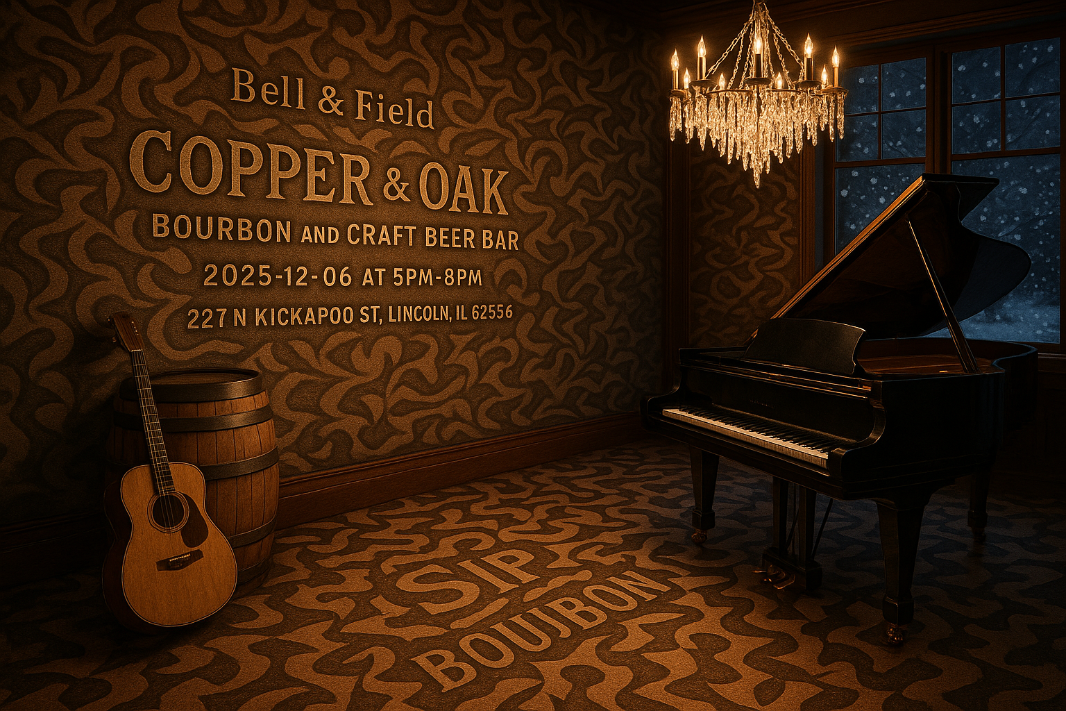People enjoying drinks at a bar.Looking for a spectacular event to spice up your weekend? On December 6, join us at Copper & Oak Bourbon and Craft Beer Bar in Lincoln, IL, for an evening of live music and finely curated spirits! Enjoy the musical talents of Bell & Field, paired with a selection of bourbons and craft beers that will make your taste buds sing. The event starts at 5:00 PM and concludes at 8:00 PM, offering you a perfect blend of entertainment and relaxation.